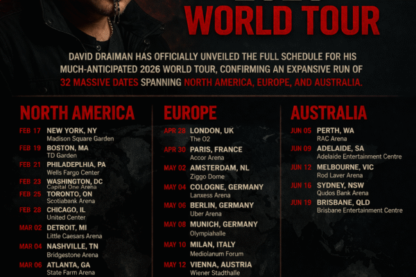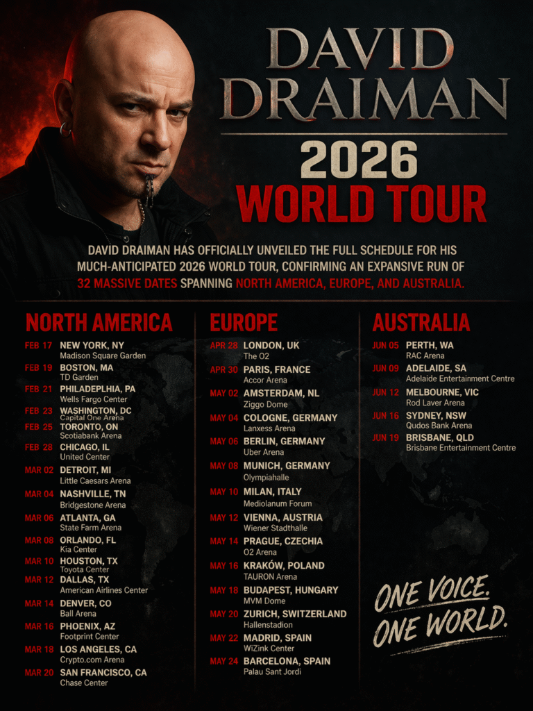 David Draiman has **officially unveiled the full schedule** for his much‑anticipated **2026 World Tour**, confirming an expansive run of **32 massive dates** spanning **North America, Europe, and Australia**. The announcement, shared across his social platforms, marks a major moment for fans eager to see the Disturbed frontman return to the road with his own headline…