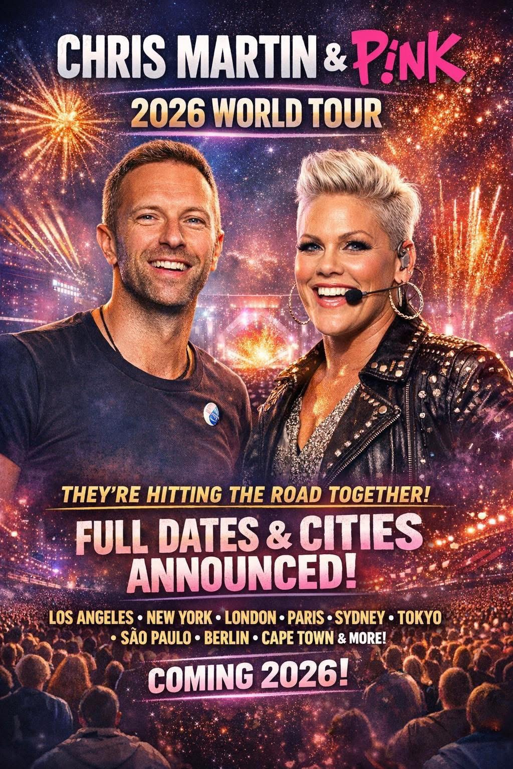 Titled **β€œHEARTS & HORIZONS: The 2026 World Tour,”** the tour brings together two of the most emotionally powerful and visually ambitious performers in modern music. Chris Martin’s ethereal, soul-lifting artistry meets P!nk’s fearless, high-octane vocal firepower in a production designed to blend intimacy, spectacle, and raw human connection.