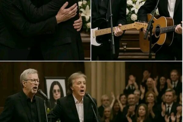“Two Legends – One Final Farewell” — Eric Clapton and Paul McCartney Break Down in Song at Ozzy Osbourne’s Funeral, as Music Becomes the Last Prayer Inside the sacred walls of the Birmingham church, where white flowers blanketed the aisles and silence weighed heavy on every heart, two musical giants—Eric Clapton and Paul McCartney—stepped quietly onto the altar. There were no stage lights, no cheers—only a guitar, trembling hands, and one final song of goodbye. Clapton began with the haunting notes of Tears in Heaven, his voice fragile yet full of sorrow. Paul joined in during the chorus, their harmonies carrying the weight of every mourner’s grief. As the last note faded, Paul whispered, “For you, brother Ozzy…” — and the two men embraced, overwhelmed by emotion. In that moment, no one could hold back tears. A generation had just lost a piece of its rock soul. But the music—that stayed. And it spoke louder than words ever could…..