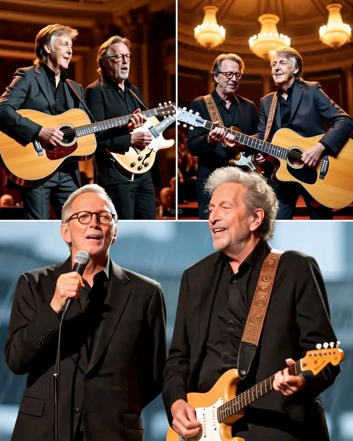 A Once-in-a-Lifetime Moment: Paul McCartney, Eric Clapton, and Bob Dylan Share the Stage — And the World Stopped Breathing At what seemed like an ordinary night at the Royal Albert Hall, the lights dimmed after the final act. The audience rose to leave — until a single guitar note echoed in the dark. It was Eric Clapton. Then came Paul McCartney, cradling his iconic bass. And finally, a raspy, unmistakable voice cut through the silence: “How does it feel…” Bob Dylan walked out. The hall froze. The three legends had never performed together on the same stage — until now. They played “While My Guitar Gently Weeps,” “Layla,” and “Blowin’ in the Wind” as if the entire history of rock was flowing through their veins. People wept. Some dropped to their knees. It was an evening no one would ever forget