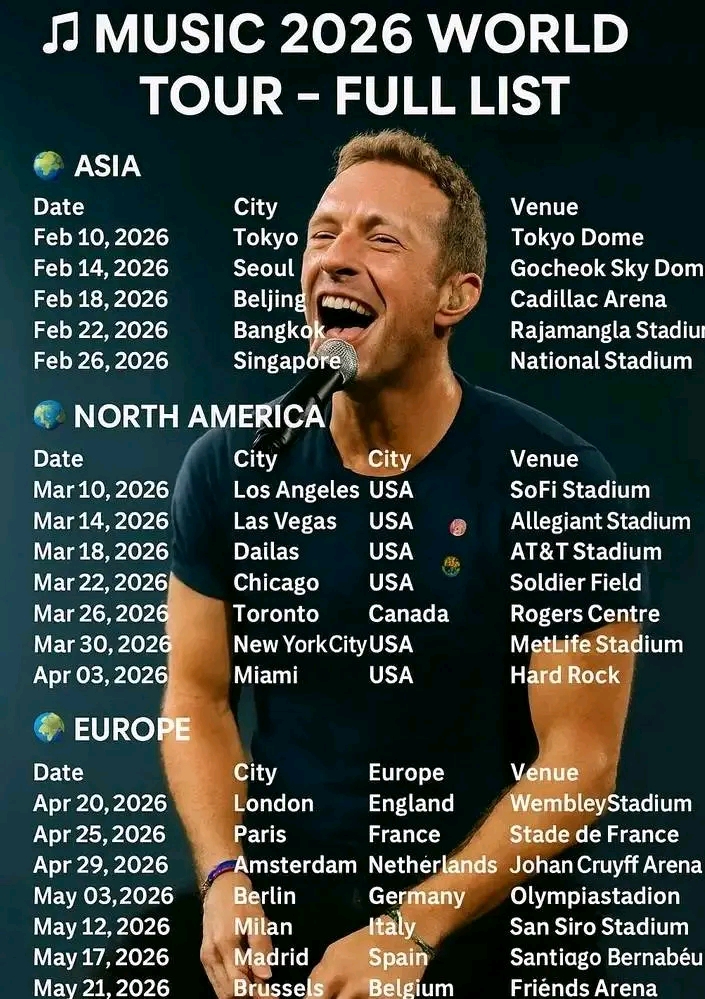 After months of anticipation and speculation, Coldplay’s tour organizers have officially confirmed the cities that will host the band’s upcoming **World Tour** — a groundbreaking celebration of music, unity, and sustainability. Following an overwhelming response of **over 150 city bids** spanning **40+ U.S. states and international regions**, the final selection has been unveiled, setting the stage for what promises to be **one of the most ambitious tours in modern music history**.