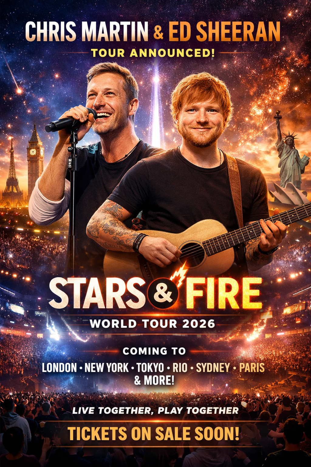 After months of fan speculation, **Chris Martin of Coldplay and global superstar Ed Sheeran have officially confirmed their highly anticipated 2026 **co-headlining world tour** — a historic collaboration between two of the biggest names in modern music. The announcement, shared via social media and press outlets, confirms that the **“Starlight & Fire: The World Tour 2026”** will span multiple continents, bringing an electrifying blend of both artists’ iconic sounds to stadiums and arenas around the globe.