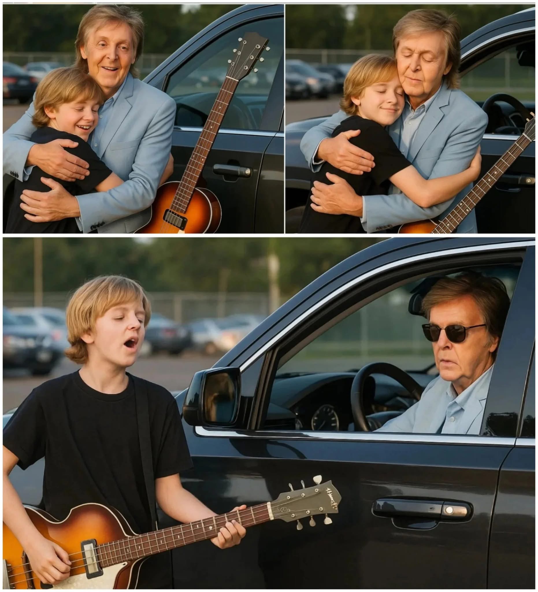 What happened next was a heartwarming surprise. Paul stepped out of his SUV, walked over to the boy, and asked to see the guitar. With a gentle and kind demeanor, Paul took a marker and signed the instrument, turning a simple guitar into a treasured keepsake — a once-in-a-lifetime gift from one of the greatest musicians of all time.
