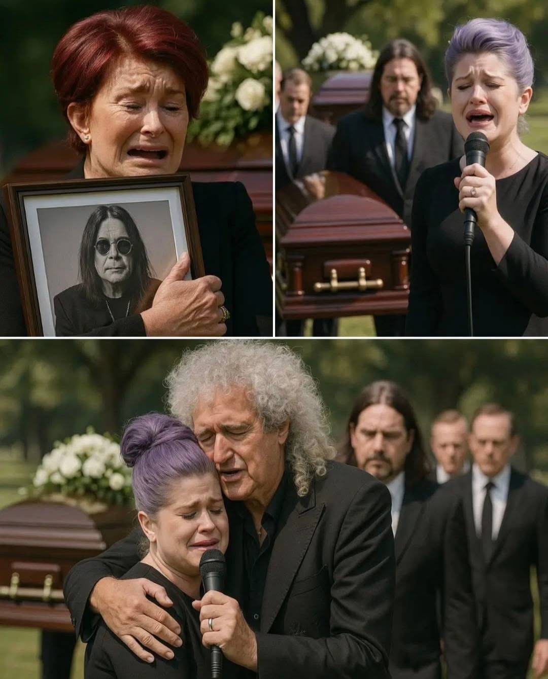 Her voice cracked mid-verse, and the lyrics caught in her throat. As the emotion surged, Kelly broke into uncontrollable sobs, knees giving way beneath her. The church held its breath. From the pews, Brian May — legendary Queen guitarist and Ozzy’s dear friend — stepped forward. Without hesitation, he picked up a nearby guitar, and in a hush that fell over the room, he continued the melody she couldn’t finish.