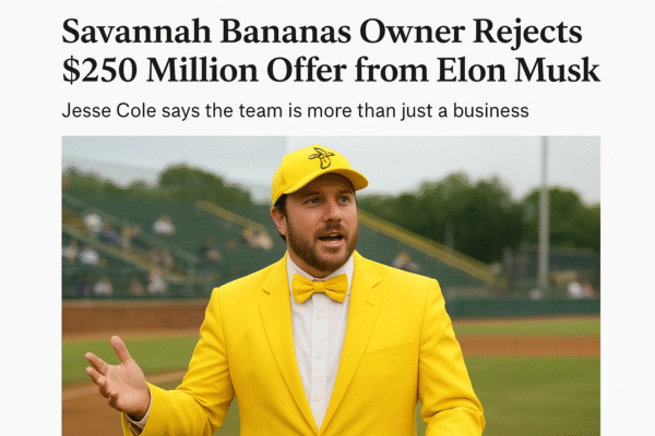 In a surprising twist that has stunned both the sports and business worlds, Savannah Bananas owner Jesse Cole has officially rejected a jaw-dropping \$250 million takeover offer from billionaire tech mogul Elon Musk. Known for his visionary leadership and his signature yellow tuxedo, Cole has made it clear that the Bananas are more than just…