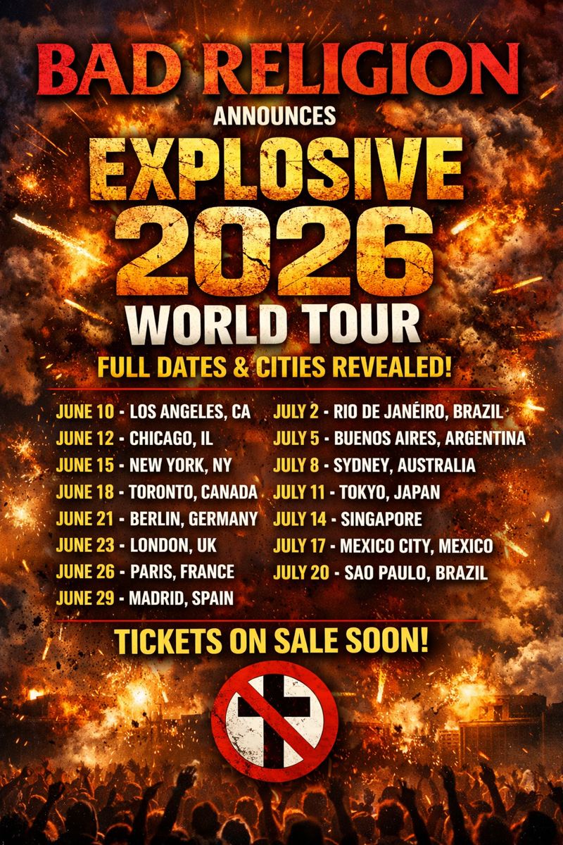 Tickets for the Explosive 2026 World Tour are expected to go on sale soon, with high demand anticipated across all dates. Fans are encouraged to act fast, as many shows are likely to sell out quickly. With this announcement, Bad Religion prove once again that punk rock is far from finished—and 2026 is about to get loud.