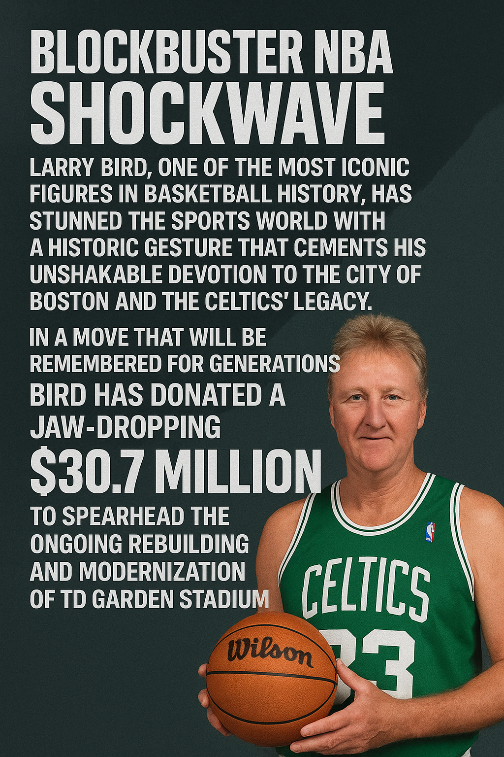 BLOCKBUSTER NBA SHOCKWAVE: Larry Bird, one of the most iconic figures in basketball history, has stunned the sports world with a historic gesture that cements his unshakable devotion to the city of Boston and the Celtics’ legacy. In a move that will be remembered for generations, Bird has donated a jaw-dropping **\$30.7 million** to spearhead the ongoing rebuilding and modernization of **TD Garden Stadium**, the hallowed home of the Boston Celtics.