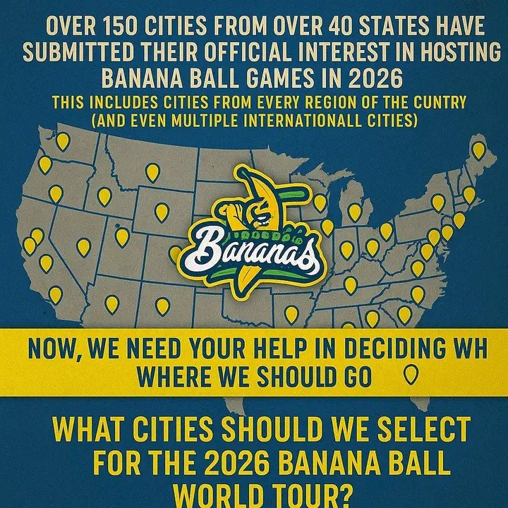 The Savannah Bananas’ fast-rising sensation, *Banana Ball*, has officially gone national— and international. Sources confirm that more than **150 cities across over 40 states** have formally submitted their interest to host Banana Ball games in 2026. From small towns to major metropolitan hubs, the response underscores just how explosive the demand has become for the high-energy, entertainment-first version of baseball.
