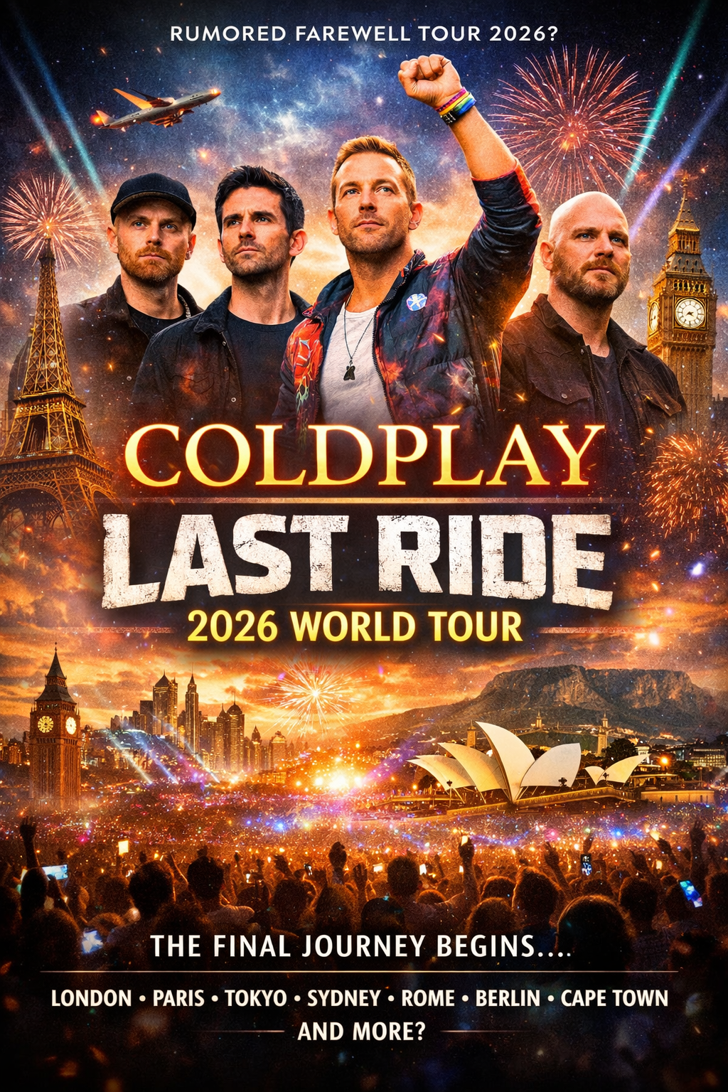 British rock icons **Coldplay** have sparked huge excitement with talk of a major **2026 worldwide tour**, often referred to online as their *“Last Ride”* or *farewell tour* — but details remain *partially speculative*. Some fan-posted announcements widely shared on social media claim a full 2026 itinerary of dates and cities across Europe, Asia, Australia and Africa, with shows in **London, Paris, Berlin, Rome, Tokyo, Seoul, Singapore, Sydney, Auckland** and closing in **Cape Town** by October 2026. These posts describe it as a celebratory global send-off with stunning visuals and a setlist spanning their entire career.