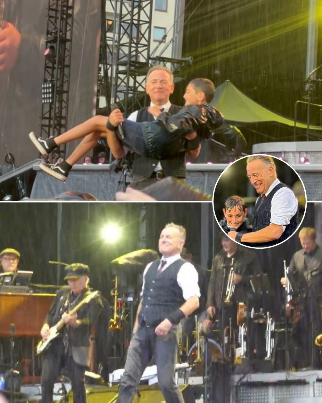 During a rainy night in Bergen, Bruce Springsteen turned what could have been a dreary, weather-soaked show into a moment of pure magic. As the skies poured down and the crowd huddled beneath ponchos and umbrellas, Springsteen invited a young boy on stage during his uplifting anthem, “Waiting on a Sunny Day.” What followed was nothing short of heart-melting.