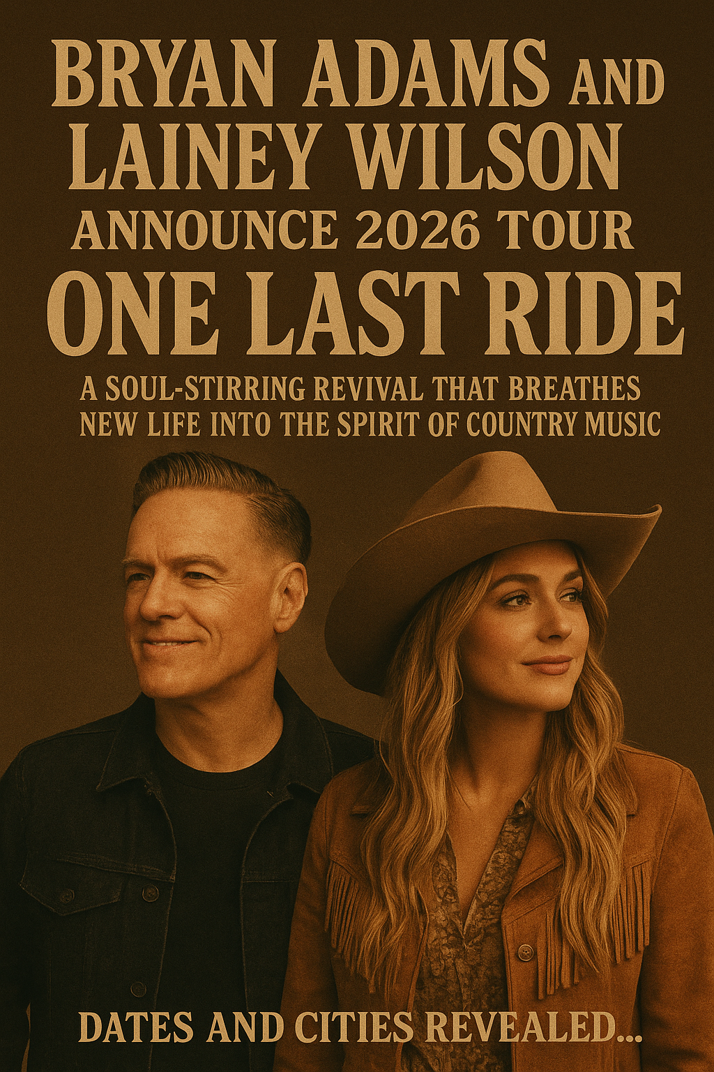 In a thrilling moment for fans of both rock and country music, Bryan Adams and Lainey Wilson have officially announced their monumental 2026 co-headlining tour, “One Last Ride.” The announcement marks a historic collaboration between two powerhouse performers whose musical roots, though distinct, share the same spirit of passion, storytelling, and authenticity.