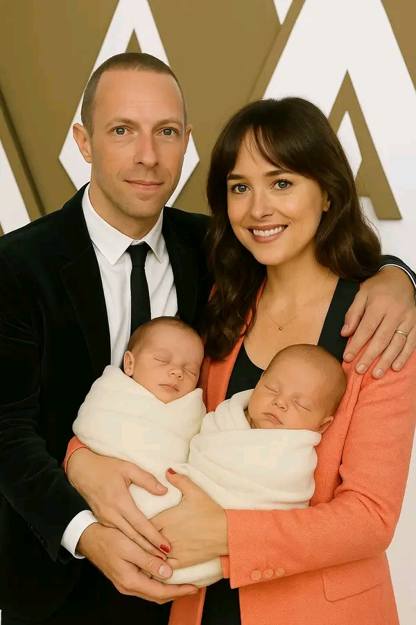 Two newborn twins resting peacefully in Chris Martin’s arms — tiny hands curled, tiny breaths rising and falling against his chest. Chris, usually so composed, couldn’t hide it: a trembling smile, tears caught in the corners of his eyes. Beside him stood Dakota Johnson, one hand on his shoulder, her expression glowing with disbelief, gratitude, and the overwhelming weight of finally becoming a mother.