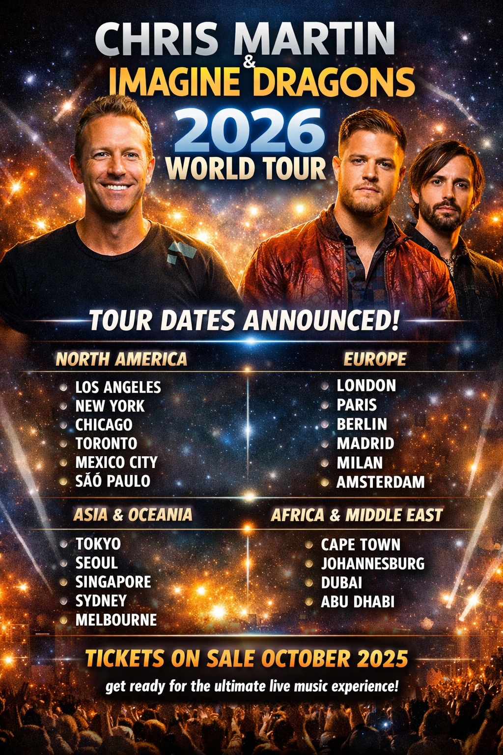 Tickets go on general sale in early October 2025, with pre-sales opening a week earlier. With demand expected to be overwhelming, the Chris Martin and Imagine Dragons 2026 World Tour is already being hailed as **one of the defining global music events of the decade**.