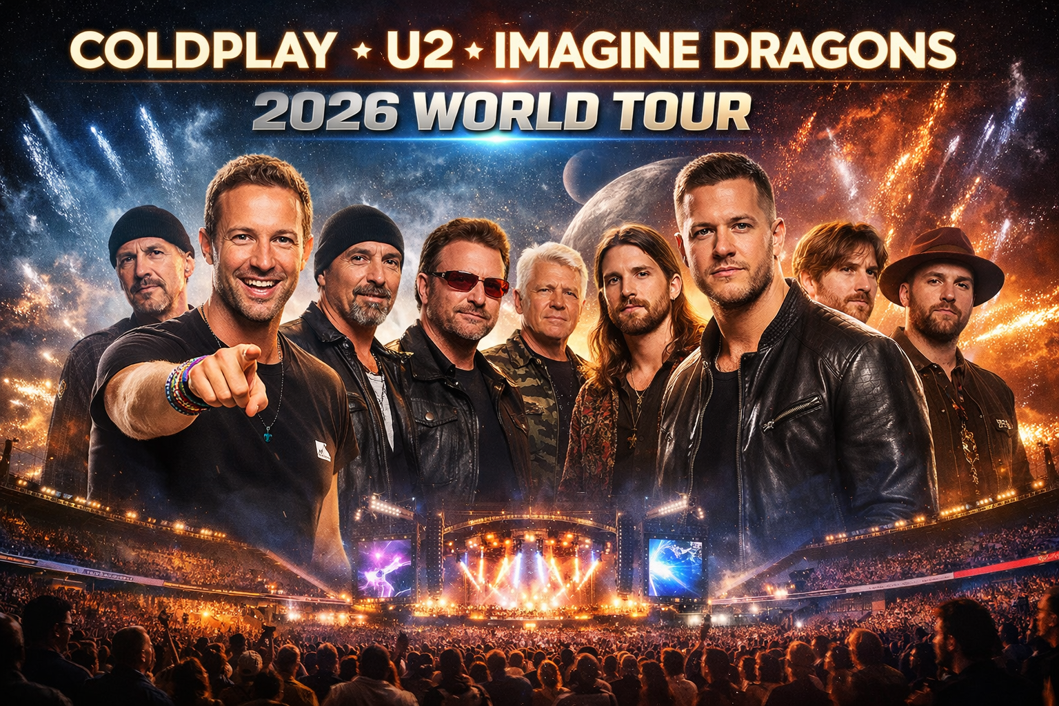 The unprecedented collaboration brings together three generations of stadium-defining artists. Fronted by **Chris Martin**, Coldplay’s visionary energy and emotionally charged anthems will merge with **U2’s** legendary status as one of the most influential rock bands in history, led by **Bono**, **The Edge**, **Adam Clayton**, and **Larry Mullen Jr.** Completing the powerhouse lineup, **Imagine Dragons**—helmed by **Dan Reynolds**—add their explosive, genre-blending sound that has dominated global charts for over a decade.