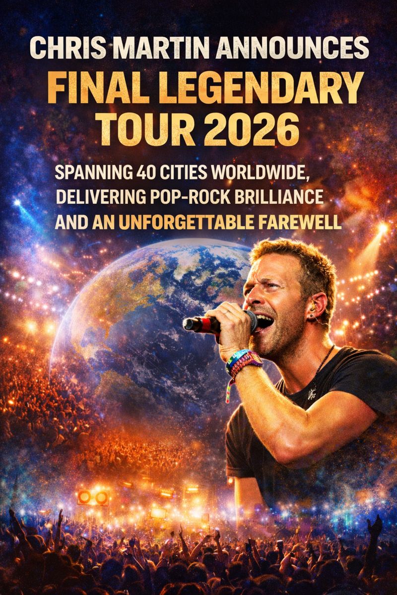 Chris Martin has officially announced what he is calling his final legendary world tour, set for 2026, marking a historic and emotional moment for fans across the globe. Spanning 40 cities worldwide, the tour is being billed as a farewell celebration that honors decades of pop-rock brilliance while giving audiences one last unforgettable live experience.