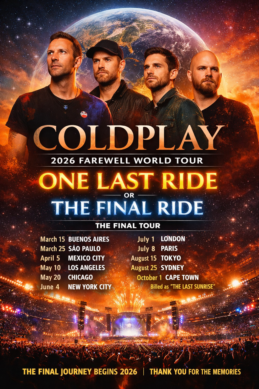 Rumors have been swirling online about Coldplay announcing a 2026 farewell world tour reportedly titled **“One Last Ride”** or **“The Final Ride,”** with supposed dates and cities circulating across social media. However, as of now, there has been **no official confirmation** from Coldplay or their management that a farewell tour under either of those titles has been formally announced.