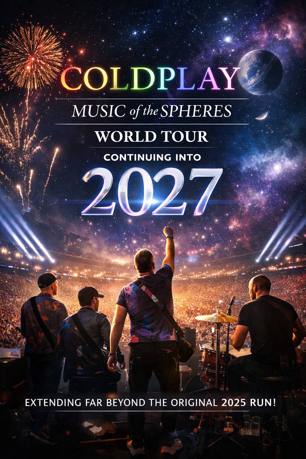 Coldplay has officially confirmed that their record-breaking Music of the Spheres World Tour will continue into 2027, extending far beyond the originally scheduled 2025 run.