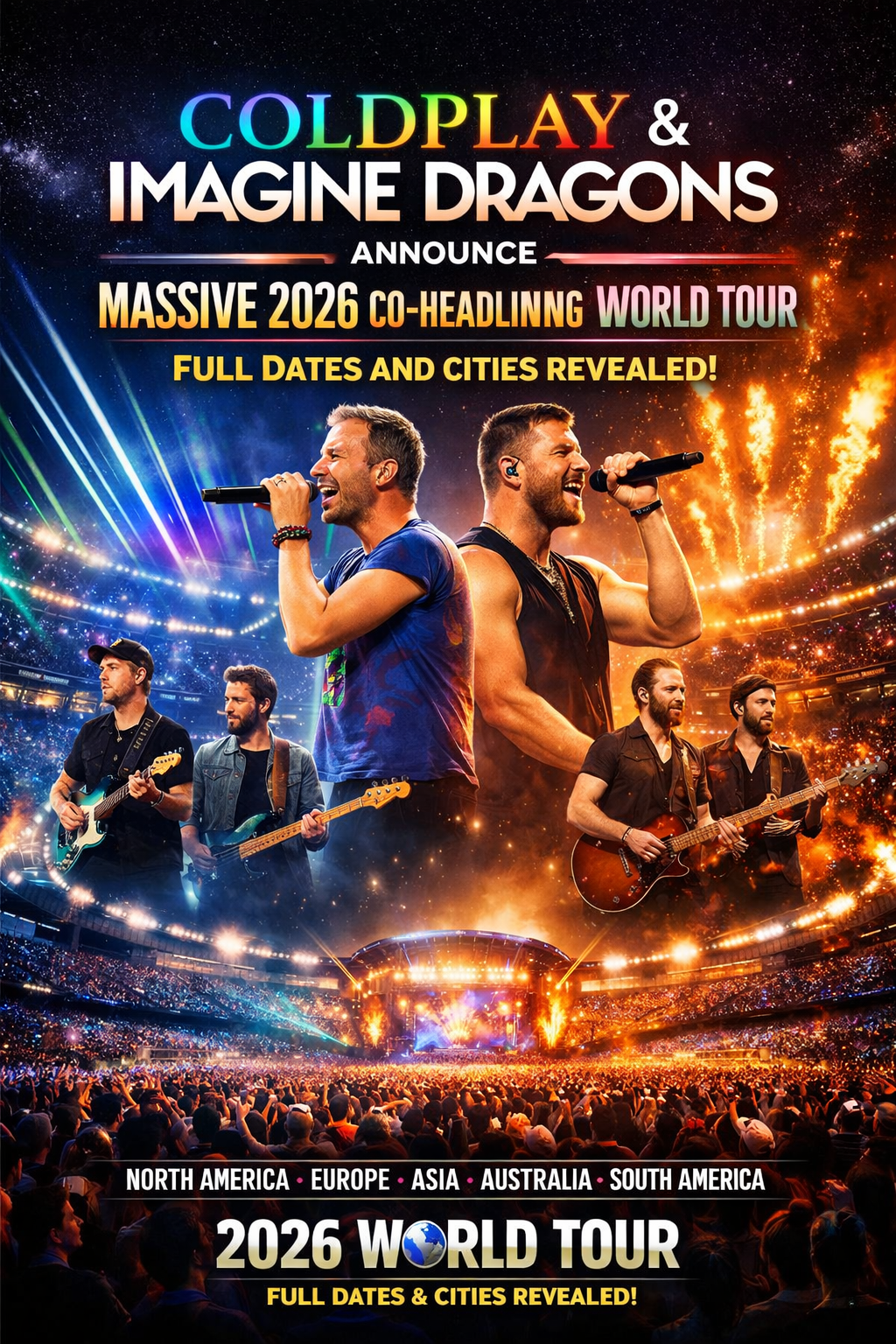 In a move set to redefine stadium touring in 2026, Coldplay and Imagine Dragons have officially unveiled a colossal co-headlining world tour, sending shockwaves through the global music community. Two of the most successful bands of the 21st century will join forces for a once-in-a-generation live experience that blends Coldplay’s emotionally charged anthems with Imagine Dragons’ thunderous, arena-shaking energy.