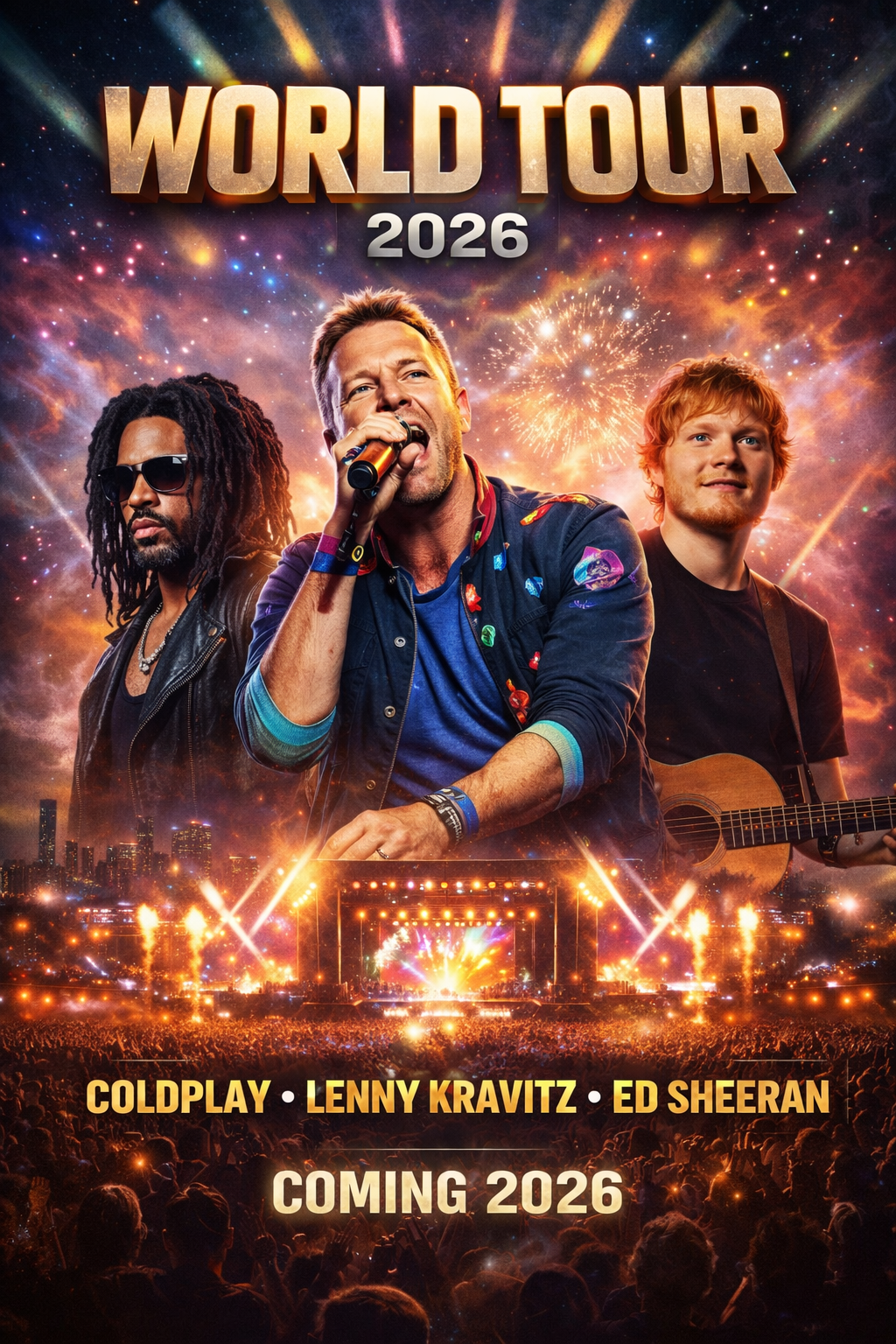 Coldplay, Lenny Kravitz, and Ed Sheeran have officially announced a monumental World Tour for 2026, marking one of the most ambitious and genre-spanning live music events of the decade. Bringing together three global powerhouses with distinct sounds and generations of influence, the tour promises a rare fusion of stadium-sized anthems, soulful rock, and intimate storytelling on an epic global scale.