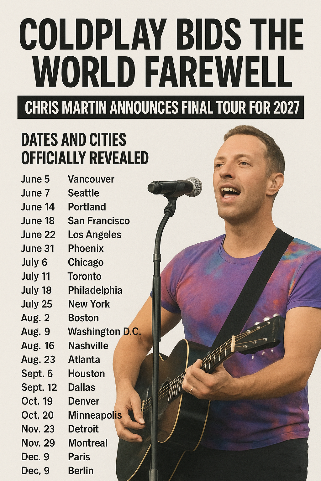 Coldplay’s Chris Martin has officially announced that the band will embark on their final tour in 2027, closing a chapter in modern music history. Known for their unforgettable anthems, dazzling live shows, and global impact, Coldplay’s farewell will be both a celebration and a bittersweet goodbye. The band has revealed dates and cities for this monumental world-spanning journey, giving fans everywhere one last opportunity to witness their artistry on stage. From intimate ballads to stadium-shaking hits, the tour promises to capture the full essence of Coldplay’s legacy. For millions worldwide, this will be a once-in-a-lifetime experience, saying farewell in harmony