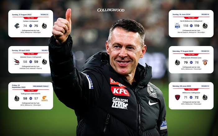 Collingwood coach Craig McRae has officially etched his name into the AFL history books, now holding the record for the most one-point victories by any coach in the league’s history. Known for his calm demeanor, tactical brilliance, and the Magpies’ never-say-die attitude, McRae has developed a reputation for guiding his side through the tightest of finishes. Under his leadership, Collingwood has mastered the art of close encounters, regularly snatching victory from the jaws of defeat and thrilling fans with heart-stopping finales.