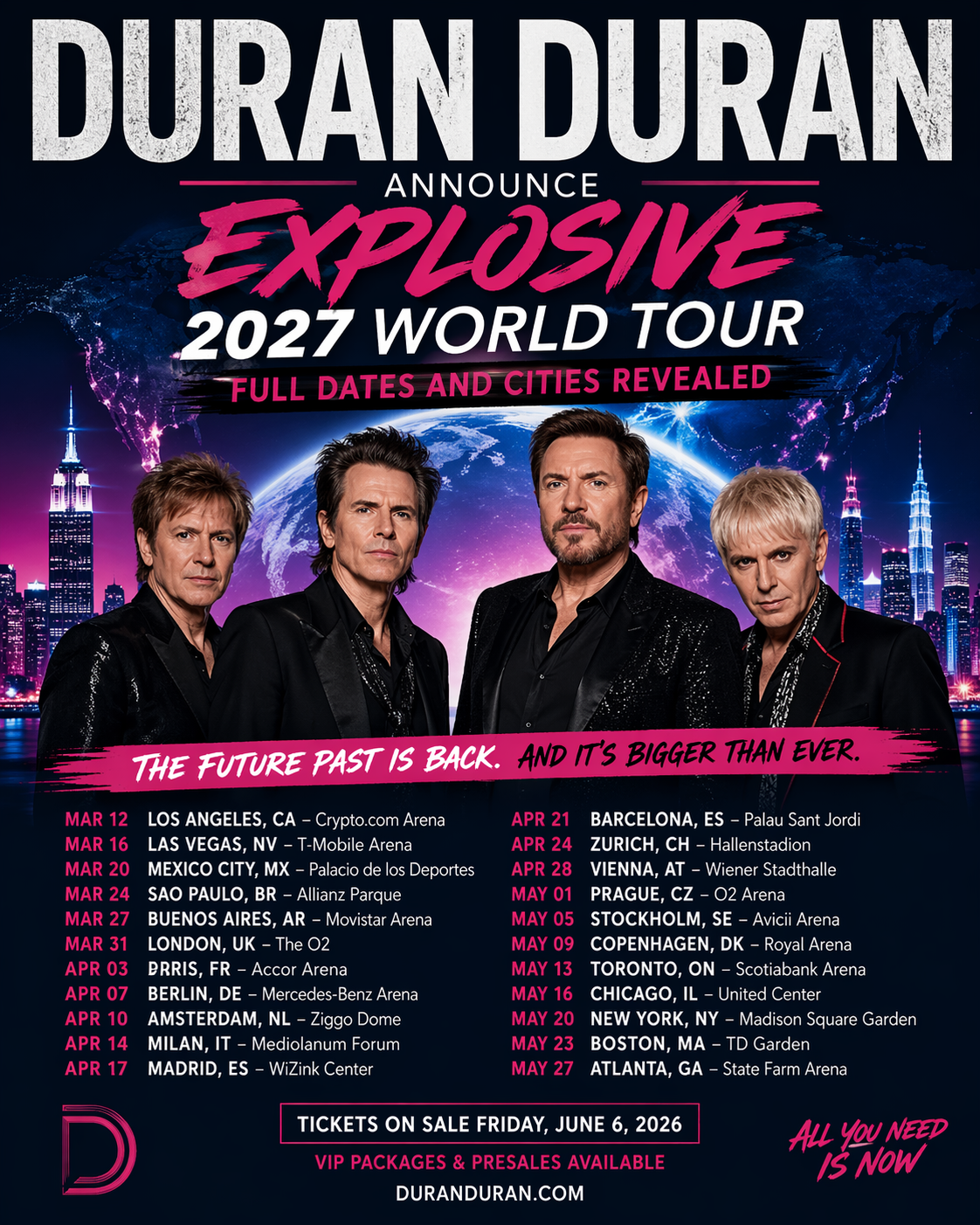 The legendary British band Duran Duran have officially ignited global excitement with the announcement of their explosive **2027 World Tour**, a massive musical journey set to span continents and generations of fans. Known for their genre-defining fusion of new wave, pop, and electronic rock, the group is once again proving their staying power with a tour that promises to be bigger, louder, and more visually spectacular than ever before.