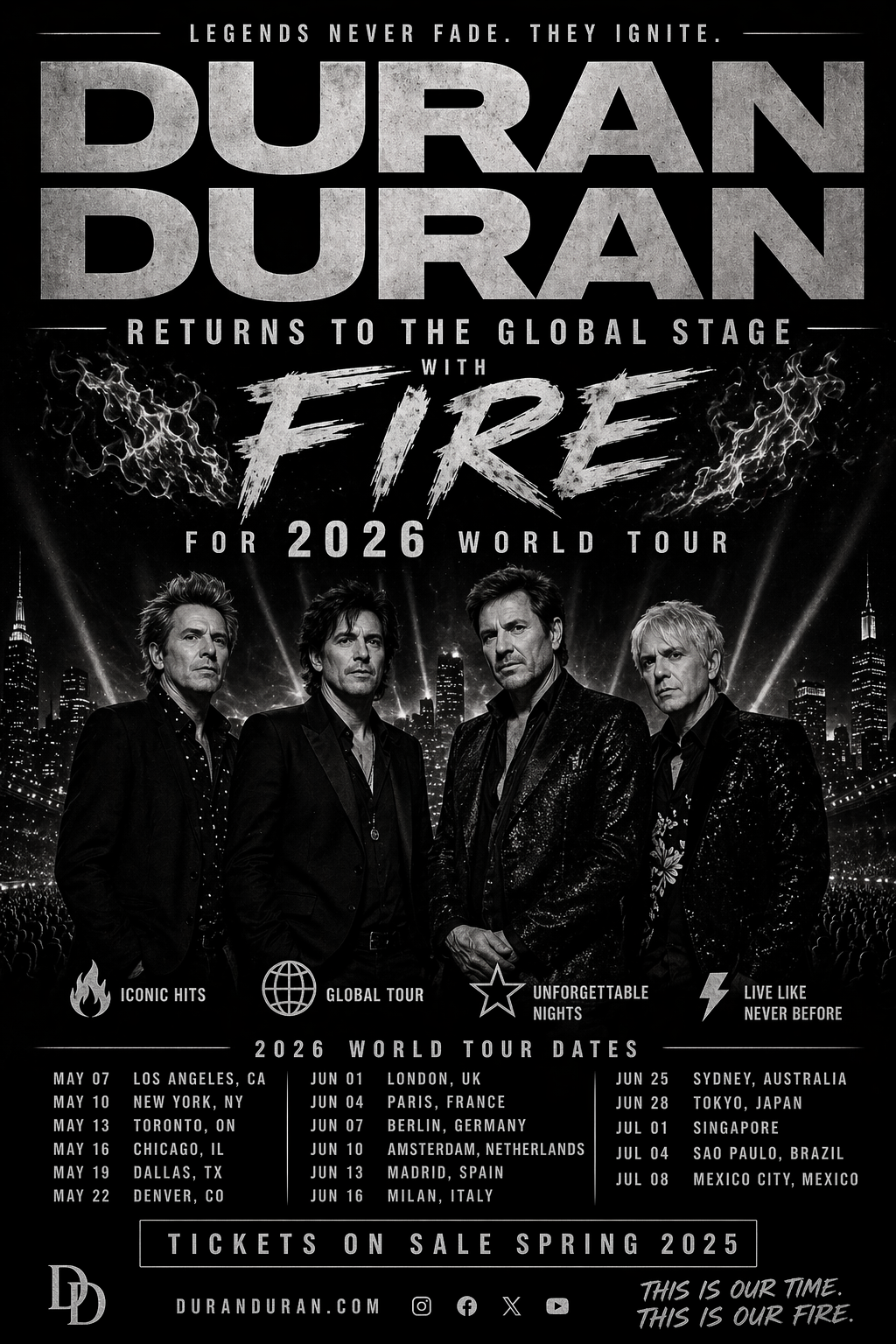 Legendary British icons Duran Duran are set to ignite stages around the world once again with the announcement of their electrifying 2026 World Tour, boldly themed *“Returns to the Global Stage with Fire.”* Known for their timeless style, innovative sound, and unforgettable live performances, the band is preparing to deliver a tour that celebrates both their iconic legacy and their enduring creative energy.