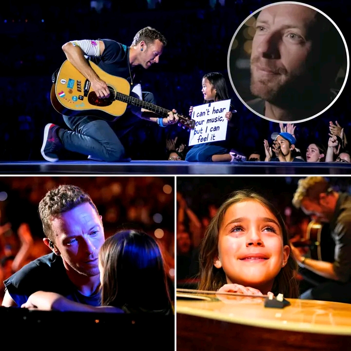 Sometimes the most powerful music is the kind you don’t actually hear . At a Coldplay concert, Chris Martin spotted a young girl in the front row holding a handwritten sign that read: *“I can’t hear your music, but I can feel it.”* It could have been just another fleeting moment in a stadium filled with thousands, but Chris turned it into something unforgettable.