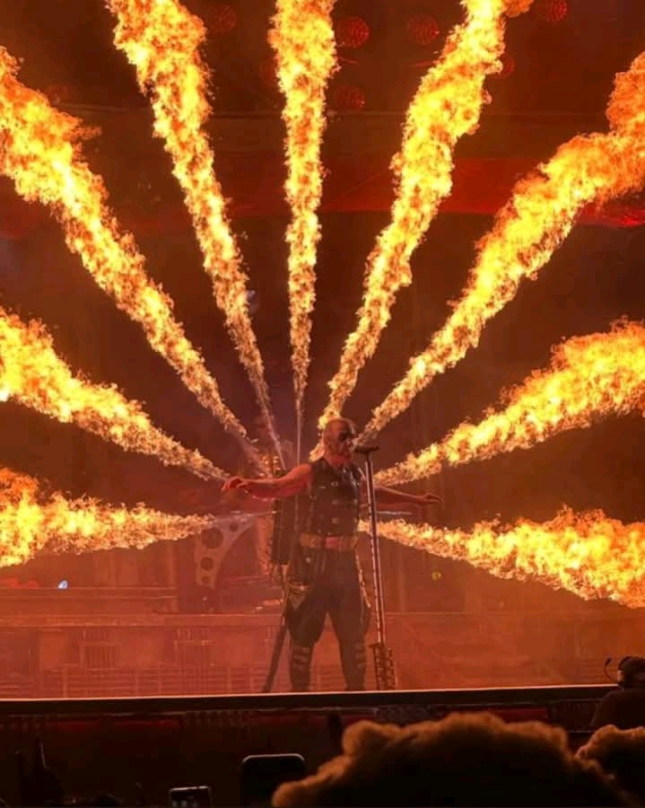 Midway through the song, Till Lindemann paused—not because something had gone wrong, but because something had gone **too right**. A massive wave of planned pyrotechnics fired earlier than expected, cloaking the stage in a rolling cloud of dense theatrical smoke. Instead of stopping, Lindemann stepped forward, stretched out his arms, and let the haze swirl dramatically around him. The crowd erupted, thinking it was all part of the choreography.