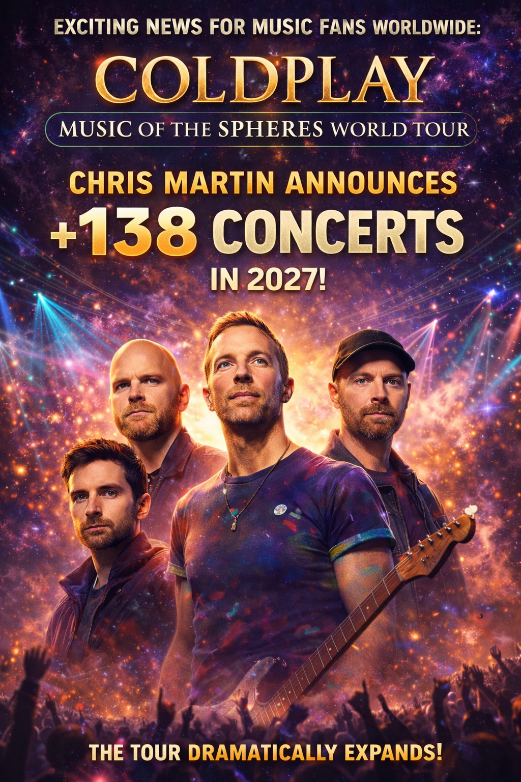 Music lovers around the globe are celebrating as **Coldplay officially announce a massive expansion of their iconic “Music of the Spheres World Tour.”** In a thrilling update, frontman **Chris Martin revealed that an additional 138 concerts** will be added to the tour’s **2027 leg**, transforming an already historic global tour into one of the largest live music events of all time.