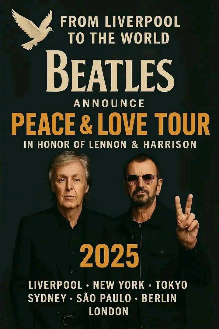 In a moment that sent waves of joy, nostalgia, and reflection through the music world, Paul McCartney and Ringo Starr have officially announced the 2025 *Peace & Love Tour*, a global tribute to their late bandmates, John Lennon and George Harrison. More than just a concert series, this tour promises to be a heartfelt celebration of friendship, legacy, and the eternal message of love that the Beatles brought to the world.
