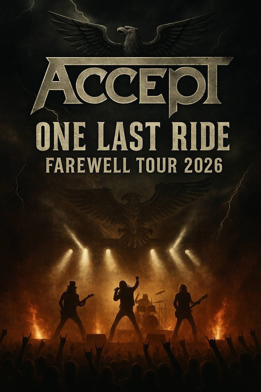 German heavy metal legends ACCEPT have announced their highly anticipated 2026 farewell tour, aptly named “One Last Ride,” marking the end of an era in rock history. Celebrating their 50th anniversary, the band will embark on a monumental world tour, delivering a unique stage show featuring surprise guests, classic hits, and rarely performed tracks. The tour will commence in Europe in late 2025, with dates in major cities including London, Paris, Berlin, and Amsterdam, followed by North American stops in New York, Los Angeles, Chicago, and Toronto. Additional performances are scheduled in South America, Japan, and Australia, making it a truly global farewell event.