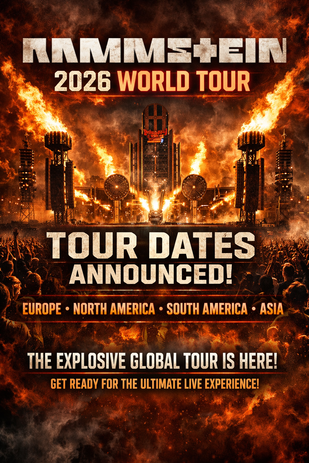 German industrial metal titans **Rammstein** have officially announced their **explosive 2026 World Tour**, confirming full dates and cities and sending shockwaves through the global rock and metal community. Known for redefining live performance with jaw-dropping pyrotechnics, theatrical staging, and uncompromising sound, the band is preparing what many insiders are calling their **most ambitious tour yet**.