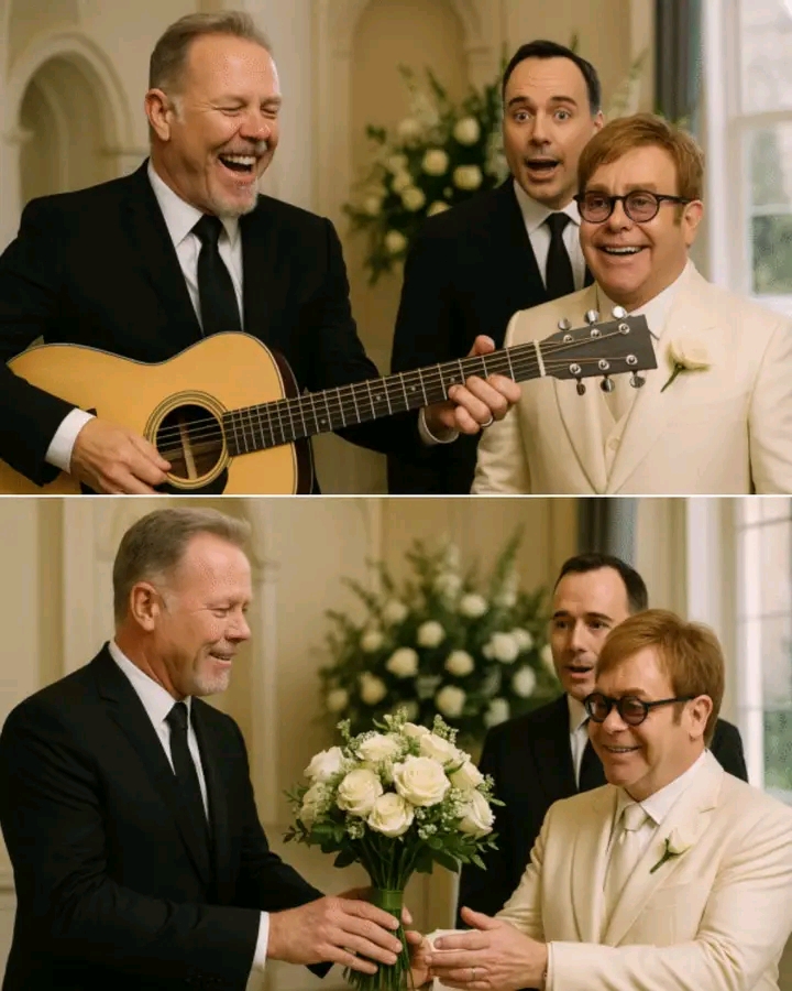 Guests at Elton John and Dav wedding were left stunned when Metallica frontman James Hetfield suddenly appeared on stage, guitar in hand, to perform a surprise number for the newlyweds — but it was the behind‑the‑scenes story that truly shocked the star‑studded room. Witnesses revealed that Elton personally called Hetfield just days before the ceremony, telling him, “I want something raw, something unexpected — play for us like you’d play for family,” and Hetfield, visibly emotional, agreed without hesitation. During the reception, after the orchestra finished its final piece, Hetfield walked out unannounced, dressed in black but smiling warmly, and began a stripped‑down, soulful rendition of “Nothing Else Matters,” reworked as a heartfelt ballad for Elton and David. The couple held hands throughout, with Elton wiping away tears as Hetfield sang the final chorus. One guest whispered, “It wasn’t a performance — it was a gift.” Within hours, clips of the moment flooded social media, fans calling it “a once‑in‑a‑lifetime crossover that only Elton could make happen.”