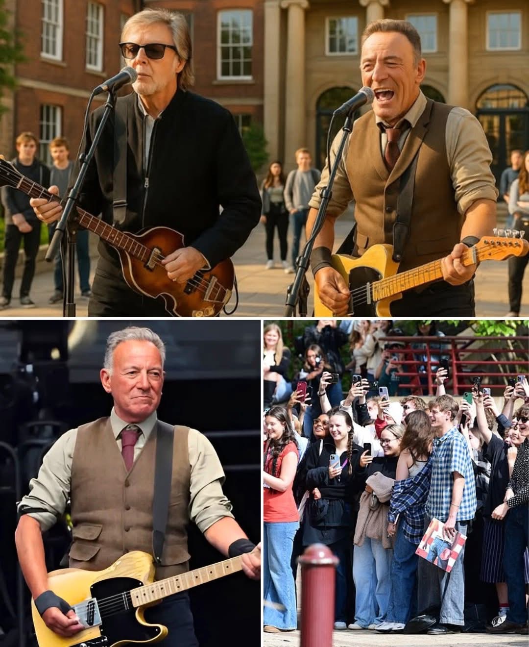 It began with McCartney’s unmistakable strum—“Twist and Shout” reverberating across the playground like a heartbeat from the past. Students froze. Teachers gasped. And then, like thunder breaking a silence, Springsteen stormed in, his voice a firestorm of grit and glory. The chemistry was instant, electric. The performance wasn’t just a song—it was a summons.