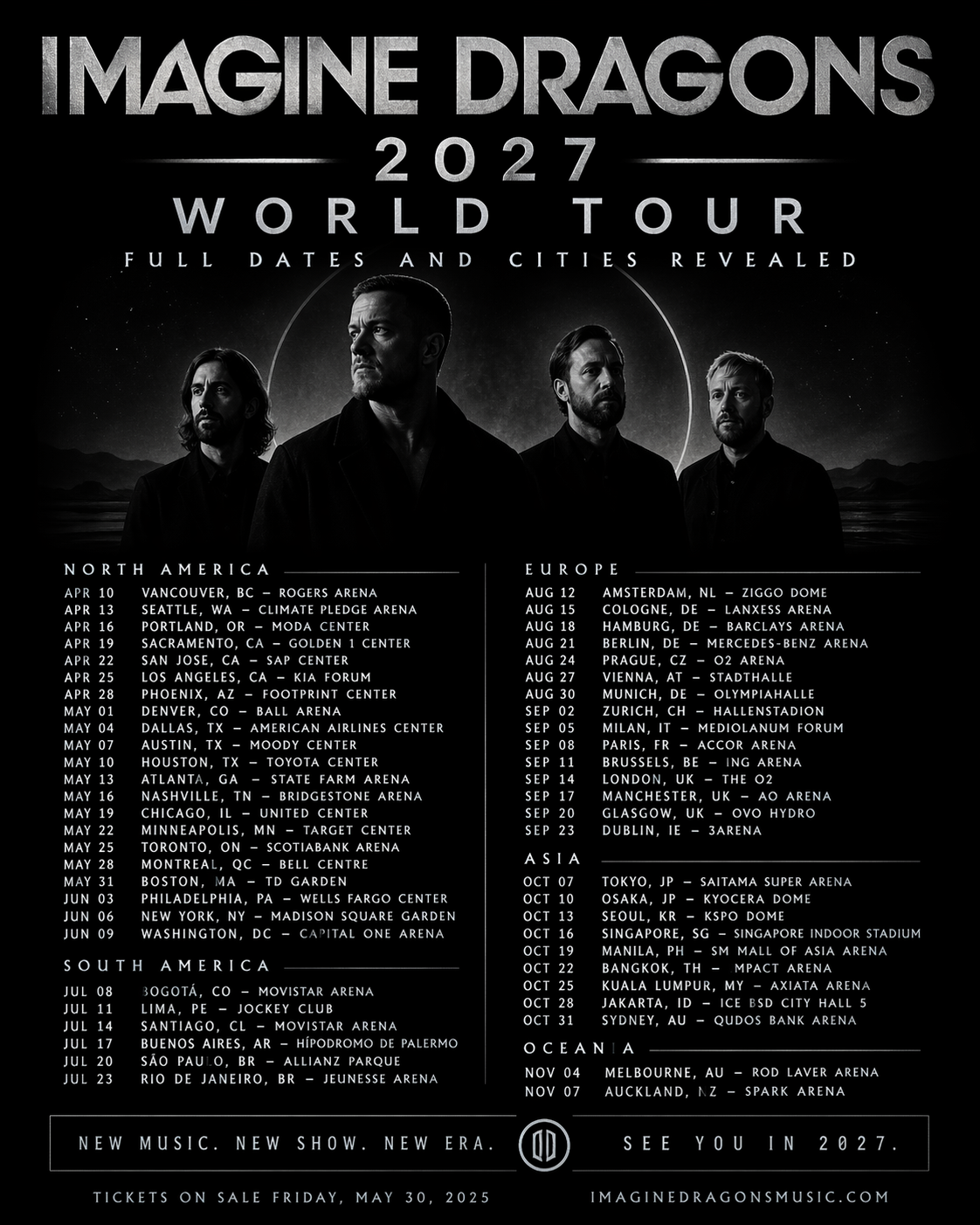 The full list of dates and cities reveals a truly global journey. The tour kicks off in North America, hitting major cities like Los Angeles, New York, and Toronto before heading to South America, with stops in São Paulo, Buenos Aires, and Santiago. From there, Imagine Dragons will storm across Europe, performing in iconic venues in London, Paris, Berlin, and Amsterdam.