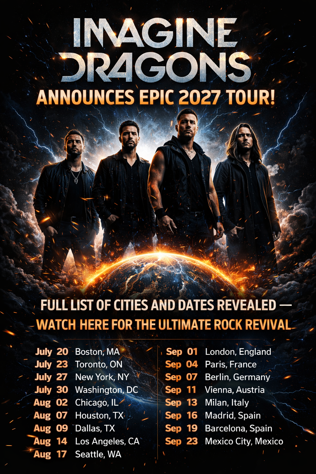 Imagine Dragons is set to ignite the global stage once again with their highly anticipated **2027 World Tour**, promising fans an unforgettable return to high-energy rock performances. Titled as an “Epic Rock Revival,” this tour marks a bold new chapter for the band, blending their signature anthemic sound with fresh, electrifying elements that celebrate both their evolution and roots.