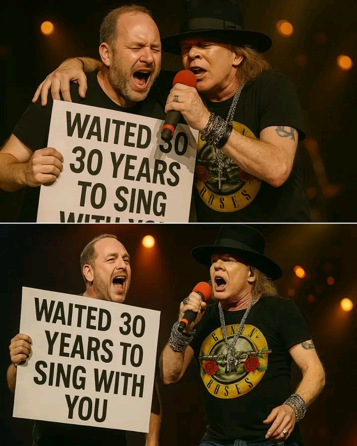 It happened in the middle of a blistering Guns N’ Roses set — the kind where the amps rattle your ribcage and the lights paint the night in fire. As the band caught their breath between songs, Axl Rose’s eyes landed on a sign in the front row: *“I’ve waited 30 years to sing with you.”*