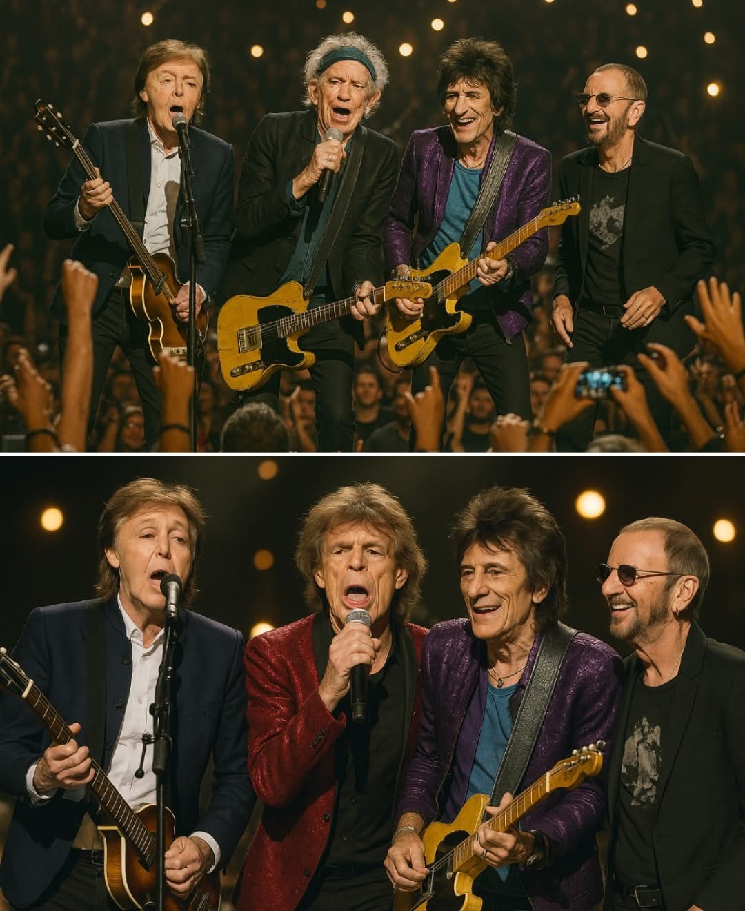 In a moment that rock fans never dared to imagine, two of the greatest musical forces in history collided in a spectacle that instantly became legend. The Beatles and The Rolling Stones—long considered friendly rivals, icons of an era—took the stage *together*, and the world seemed to tilt on its axis.