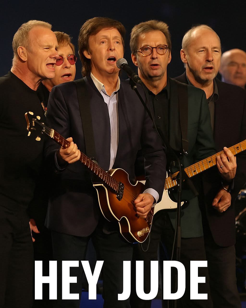 In what can only be described as a historic and electrifying moment, six of music’s most iconic figures—Paul McCartney, Sting, Elton John, Eric Clapton, Mark Knopfler, and Phil Collins—came together on one stage to perform the Beatles’ classic “Hey Jude.” It was more than a performance; it was a living tribute to the power of music, unity, and timeless artistry.