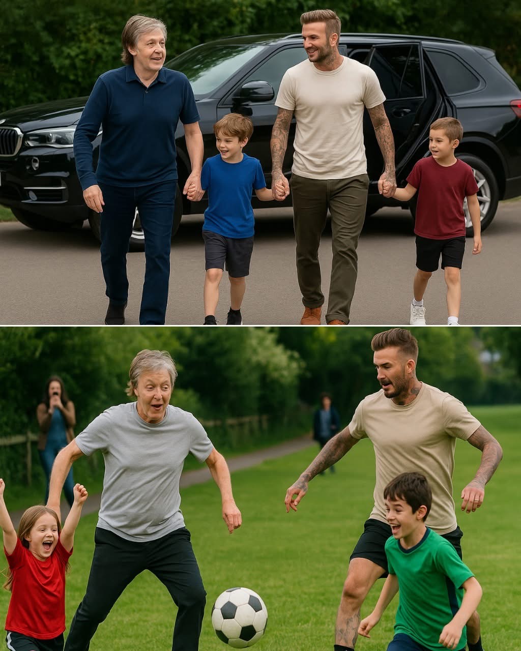 It wasn’t Wembley Stadium, but a humble patch of grass just outside London where something quietly magical happened. Paul McCartney, dressed in nothing more than a simple white T-shirt and well-worn sneakers, had brought his grandchildren out for a bit of fresh air and casual football. He wasn’t expecting much—just a few kicks of the ball, a few laughs. But fate had a surprise waiting. David Beckham, also there with his son, was standing just beyond the trees, already in mid-play when McCartney arrived. Recognizing each other instantly but without fanfare, the two legends exchanged a nod, a grin, and then, almost without words, found themselves on the same side of a spontaneous pick-up match.