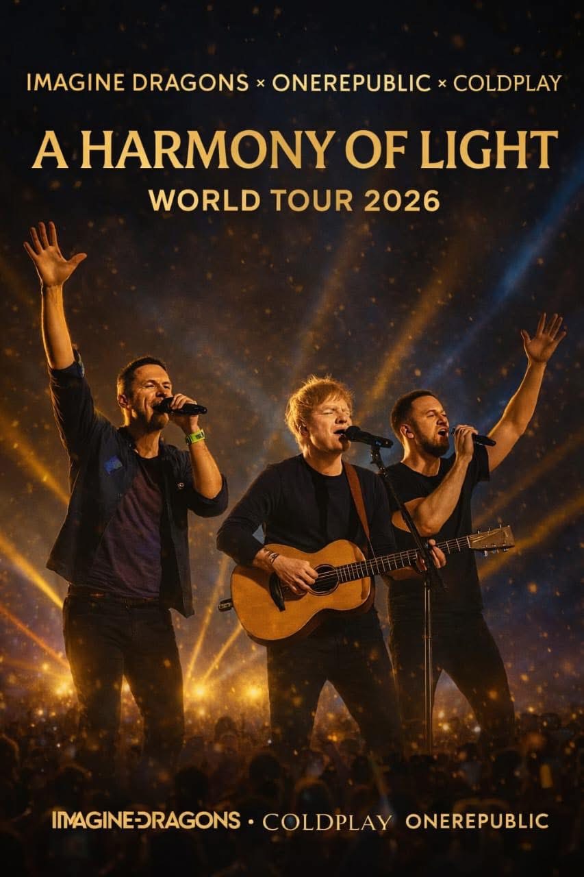 The unthinkable has become reality. Three of the most influential artists of the 21st century — **Imagine Dragons**, **Ed Sheeran**, and **Coldplay** — are officially joining forces for a monumental global stadium run titled the **“Harmony of Light” World Tour**. More than a tour, this is a cultural moment destined to redefine what a live music experience can be.