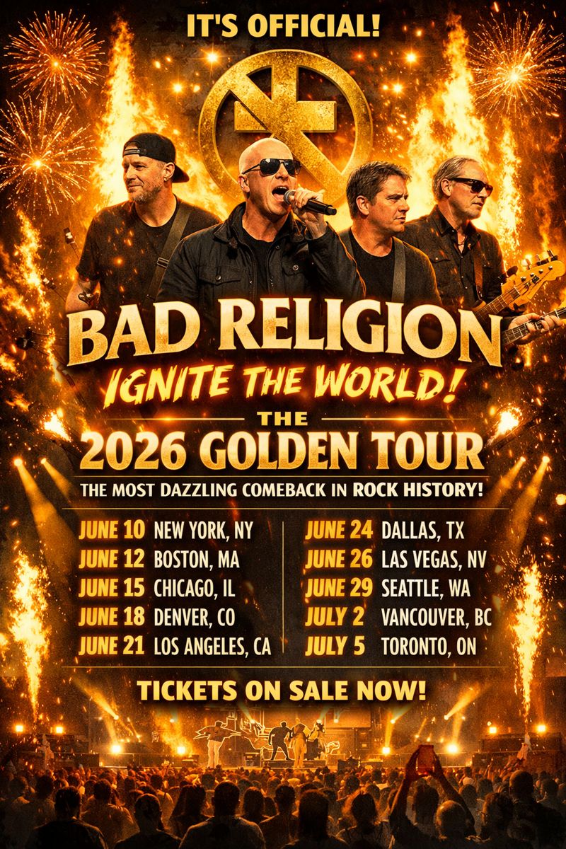 Punk rock legends **Bad Religion** are officially back, and they’re coming in louder, bolder, and more explosive than ever. The band has announced their highly anticipated **2026 Golden Tour**, a global celebration marking decades of rebellious anthems, political fire, and high-octane performances that helped define modern punk rock. Fans across the world are already calling it the most dazzling comeback in the band’s legendary career.