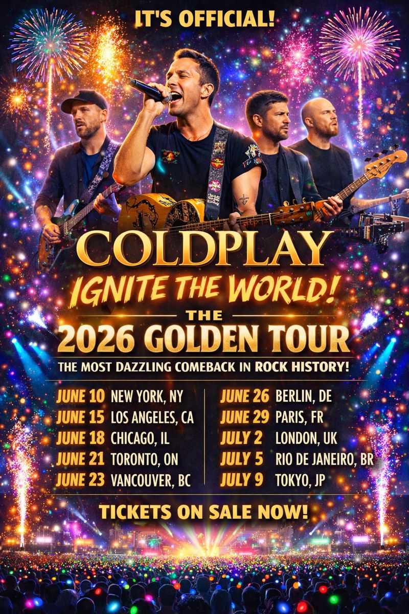 Global superstars **Coldplay** are officially back, and they’re ready to light up the world once again. The band has announced their breathtaking **2026 Golden Tour**, a massive international concert run that promises to be the most visually stunning and emotionally powerful chapter of their career. After years of record-breaking tours and chart-topping albums, Coldplay’s return is already being hailed as one of the biggest moments in modern music history.