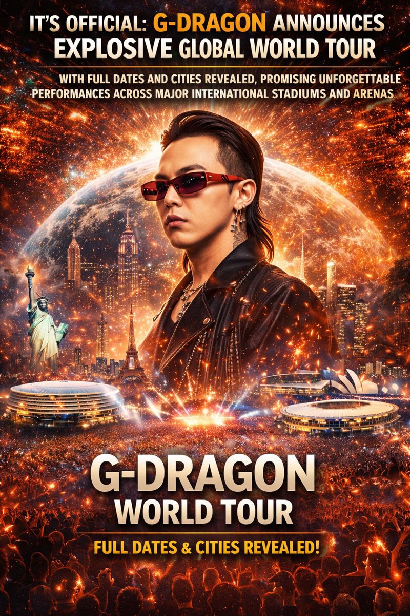 The wait is finally over. Global K-pop icon **G-DRAGON** has officially announced his highly anticipated **Global World Tour**, sending shockwaves across the music industry and igniting massive excitement among fans worldwide. After years of chart-topping hits, groundbreaking fashion influence, and unforgettable stage performances, the BIGBANG leader is ready to reclaim the global spotlight with a tour designed to redefine live entertainment.