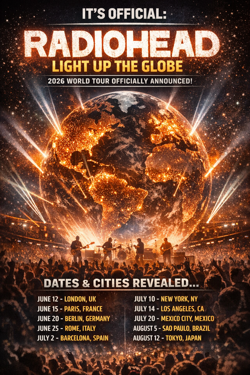 After years of speculation, silence, and subtle hints, it’s finally happening. Radiohead have officially announced their **2026 World Tour**, fittingly titled **“Light Up the Globe”**, sending waves of excitement through fans across every continent. The legendary band is set to return to the stage with a tour that promises to blend their iconic sound, immersive visuals, and deeply emotional performances into one unforgettable global experience.