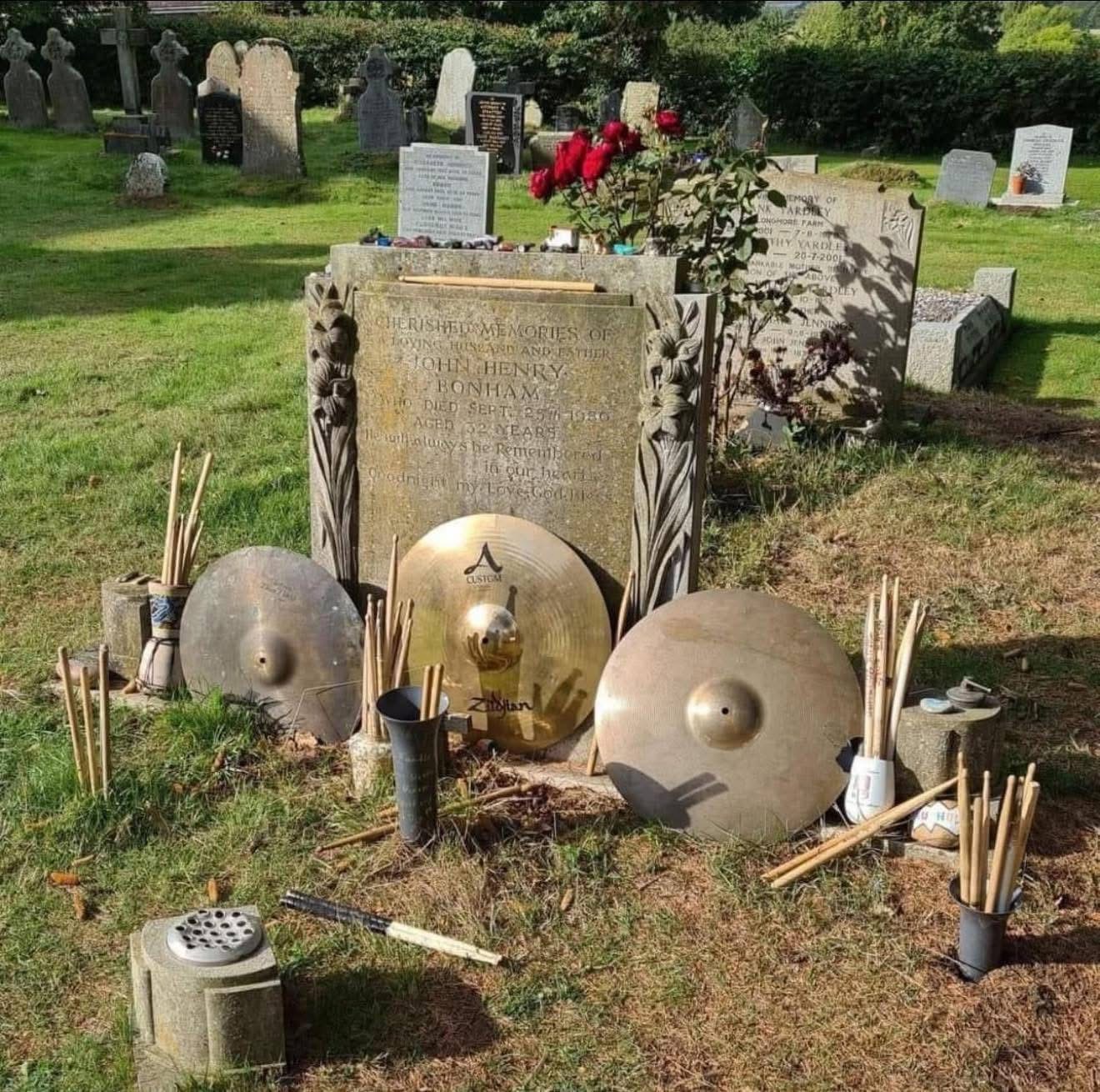 Bonham’s grave is marked by a simple headstone engraved with his name, birth and death dates, and the words “Cherished Memories of a Loving Husband and Father.” Nearby, a black headstone commemorates his legacy with a drum kit engraving and the inscription “John Henry Bonham – A Loving Husband, Father and Son – He Will Always Be Remembered In Our Hearts – Goodnight My Love, God Bless.” Visitors often leave drumsticks, flowers, and notes, showing the lasting impact he had on music and its community.