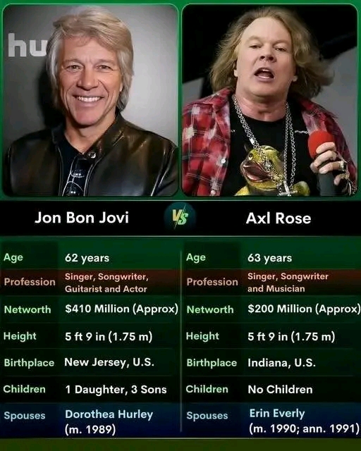 Jon Bon Jovi and Axl Rose, both born in 1962, remain two of the most influential voices in American rock history—artists whose music defined an era and continues to resonate with fans across generations. Though their careers took different paths, the two frontmen share striking parallels: both rose from modest beginnings, both reshaped hard rock in the 1980s and ’90s, and both became legendary for their unmistakable voices and electrifying stage presence.