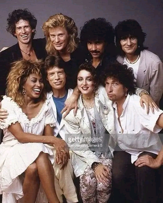 It was July 13, 1985 — the day music truly tried to change the world. Live Aid was in full swing, sending seismic waves of sound and solidarity across the globe. But backstage at JFK Stadium in Philadelphia, something equally electric was happening away from the spotlight. A single, now-legendary photograph captured a gathering of titans: Keith Richards, Daryl Hall, John Oates, Ron Wood, Tina Turner, Mick Jagger, Madonna, and Bob Dylan — a lineup so surreal it seemed pulled from a rock ‘n’ roll fever dream.