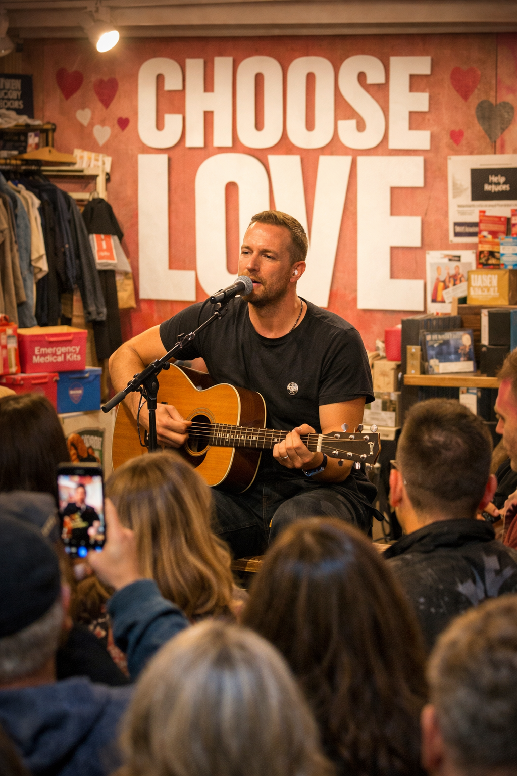 The Choose Love pop-up, known for its vibrant displays and powerful advocacy for refugees and displaced communities, suddenly felt even more intimate. As Martin settled into the space, the noise of the city seemed to fade. There were no stage lights or barriers — just music, voices, and emotion filling the room. It was a reminder of how powerful simplicity can be.
